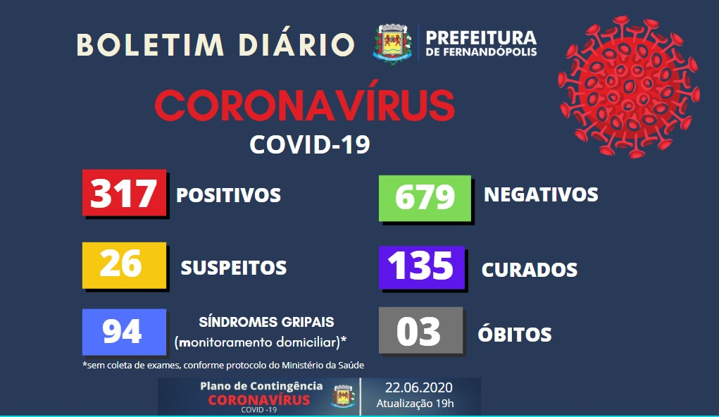 A Prefeitura de Fernandópolis informa que nesta segunda-feira, 22, foram registrados 13 novos casos de Covid-19 no município. Dos pacientes positivos, 135 pessoas receberam alta médica, 179 estão sendo acompanhadas pelos profissionais da Saúde e três morreram em decorrência da doença.