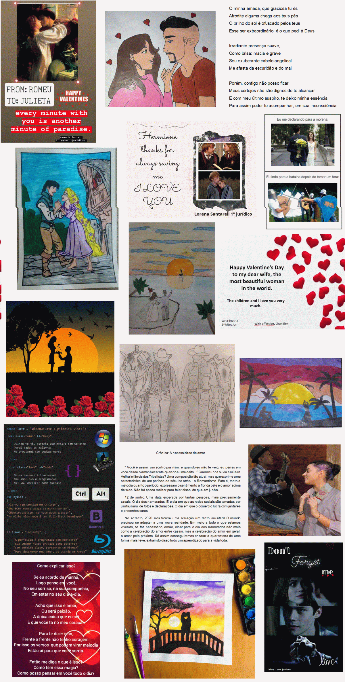 Essa atividade foi realizada durante as aulas remotas, ministradas pelas professoras de Língua Portuguesa e Literatura, Jéssica Uliana e Joslaine Scorsio, e supervisionada pelo professor de Artes e Produções Artísticas, Flávio Gárcia; nos cursos do 2º ano do Ensino Médio, 2º ano do curso Técnico de Informática para Internet Integrado ao Ensino Médio e 2º ano Exatas. Após as aulas e explicações sobre o período literário do Romantismo, foi solicitado que os alunos usassem sua criatividade para representar essa escola literária e assim, surgiram lindíssimos desenhos, desenhos digitais, Gifs, poemas, vídeos, paródias e crônicas. Além dessas turmas, também foi desenvolvido nas aulas online, pela professora de Língua Inglesa – Keysa Katiere – cartões românticos em inglês para celebrar o Dia dos Namorados. Segundo a diretora, Valdete Magalhães, esse foi um trabalho de cooperação e colaboração entre alunos e professores. Todos estão de parabéns pelo magnífico projeto.