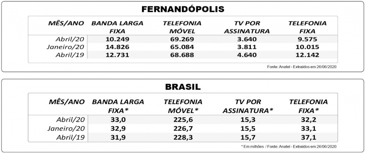 Os dados são da Anatel e foram publicados até o mês de abril de 2020. Mensalmente, o órgão divulga a quantidade de acessos no Brasil relativos aos principais serviços de telecomunicações que são fornecidos pelas próprias prestadoras e mostram a situação dos números de acessos de assinantes dos serviços de Banda Larga Fixa, Telefonia Móvel, TV por Assinatura e Telefonia Fixa.
