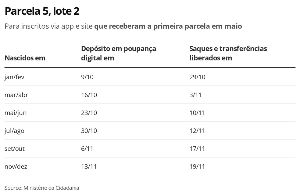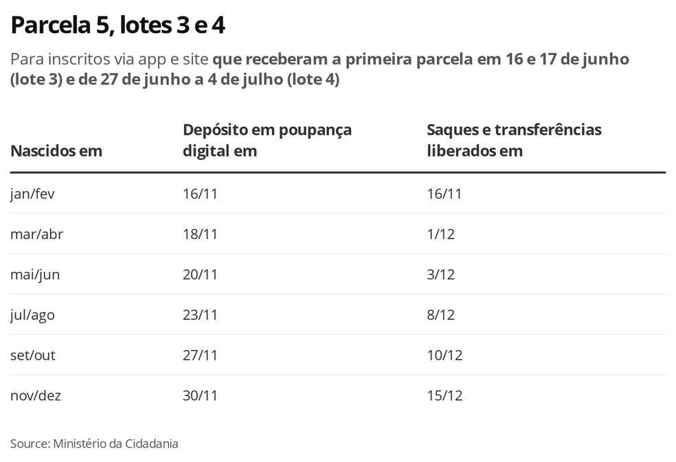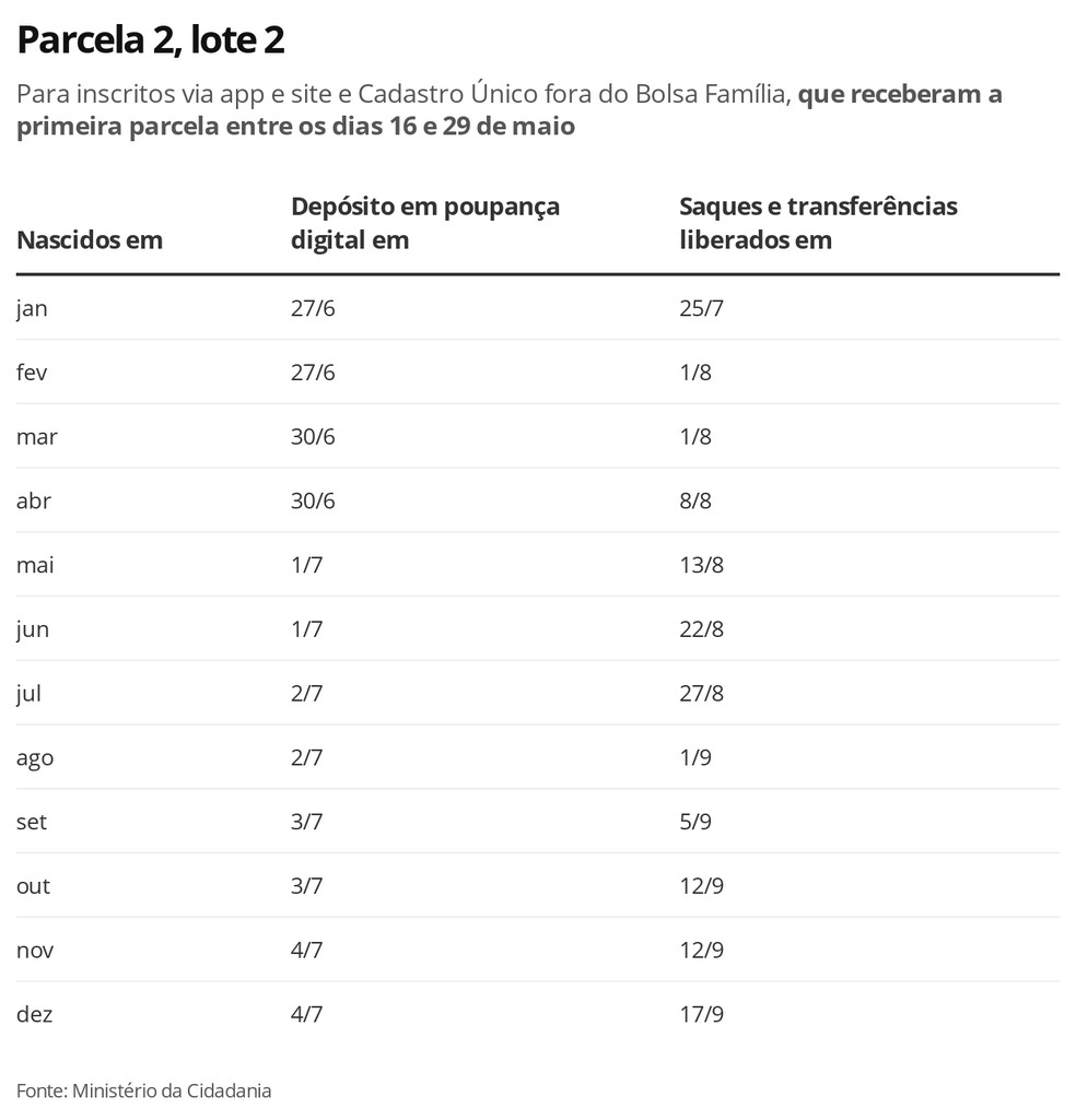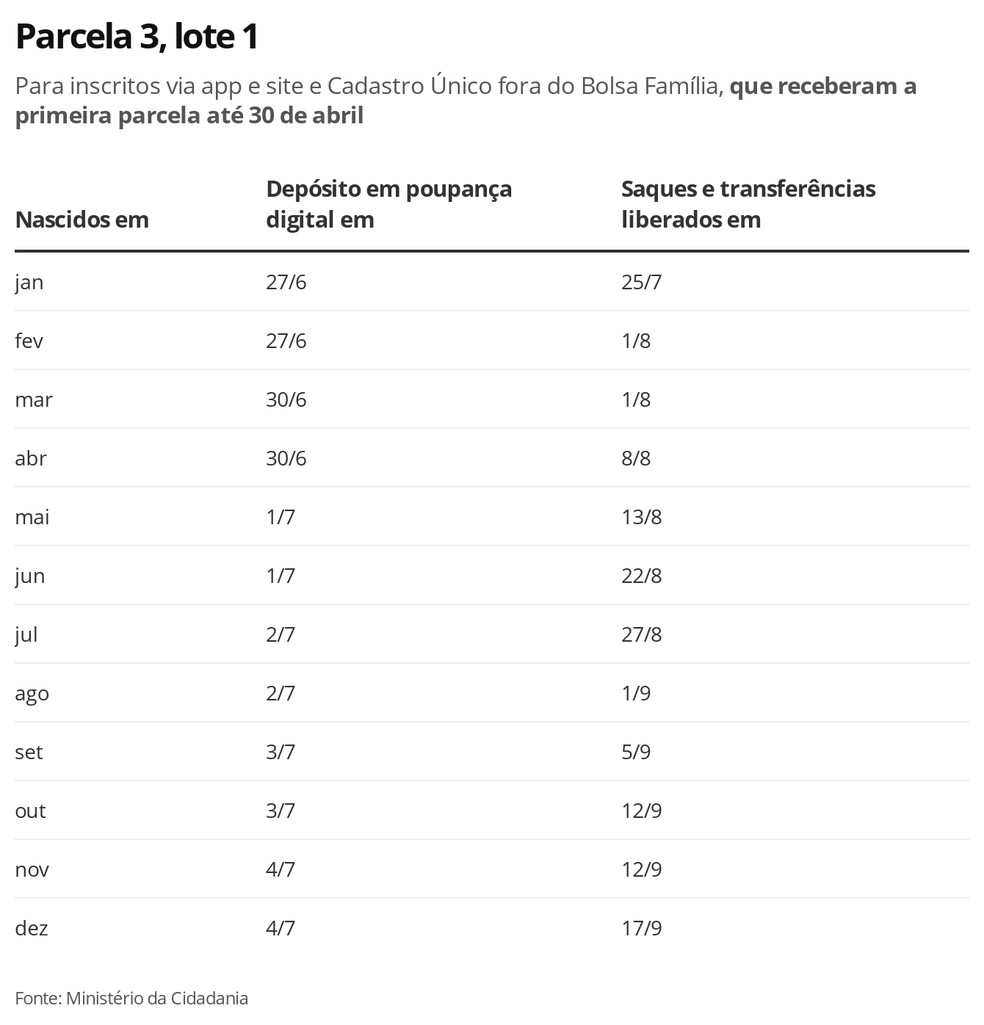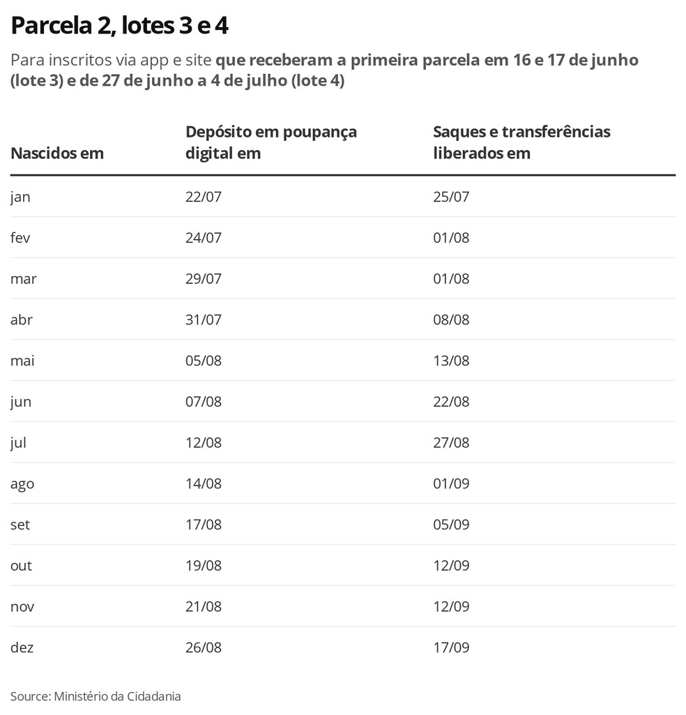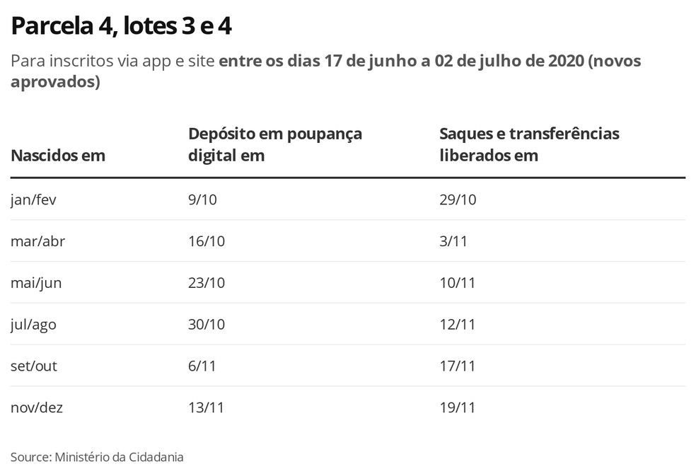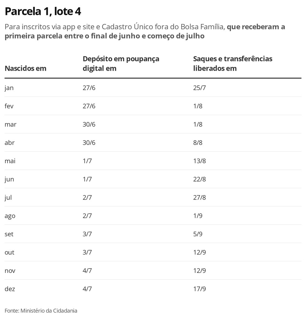 Para os demais beneficiários do Auxílio Emergencial, a quarta parcela começa a ser paga na quarta-feira, 22. A data é para aqueles que estavam no Cadastro Único e para os inscritos por meio do aplicativo e do site que receberam a primeira parcela até 30 de abril. Os demais aprovados também recebem a partir de 22 de julho, o que inclui os aprovados no segundo lote recebem a terceira parcela; aprovados no terceiro e quarto lotes recebem a segunda; e novos aprovados vão receber o primeiro pagamento.