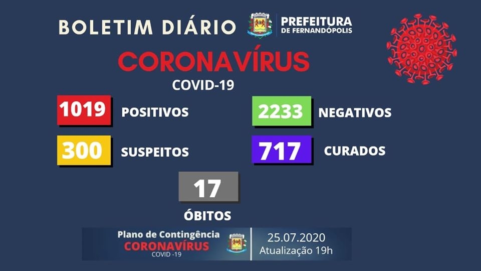 A Prefeitura de Fernandópolis, por meio da Secretaria Municipal de Saúde, informou que neste domingo, 26, foram registrados 26 novos casos de Covid-19 no município, totalizando 1.045 pacientes infectados. Desse total, 717 já receberam alta médica, 17 morreram em decorrência da doença e 311 estão em tratamento.