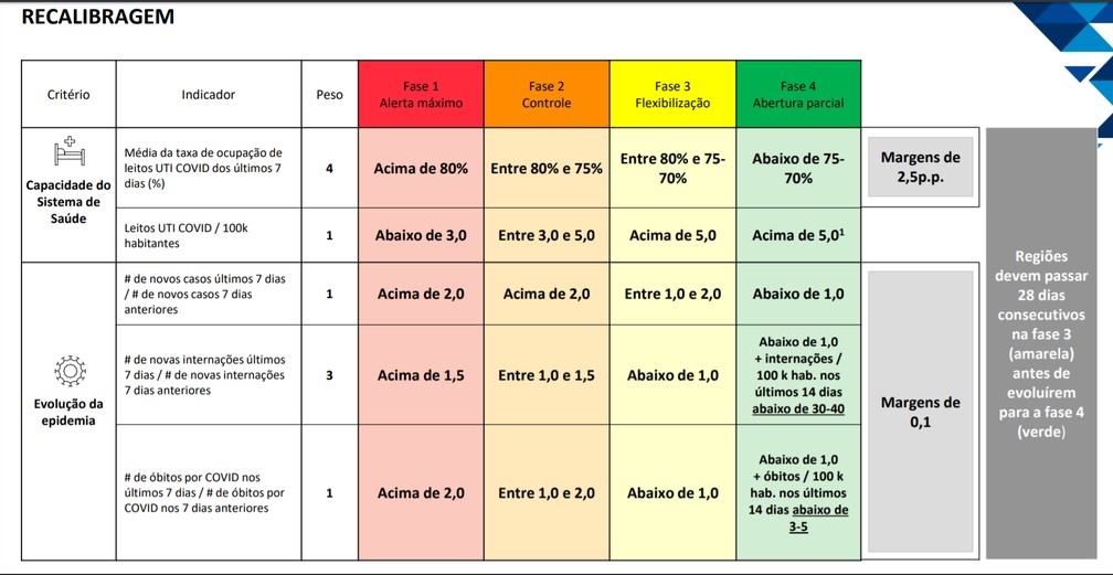Outro critério alterado foi a taxa máxima de ocupação de leitos de UTI necessária para que as cidades avancem de fase. Anteriormente, era necessário que do total de leitos disponíveis para o tratamento da Covid-19, no máximo, 60% dos leitos estivessem ocupados para que a região mudasse da fase verde para a amarela, agora o percentual é entre 70 e 75%.