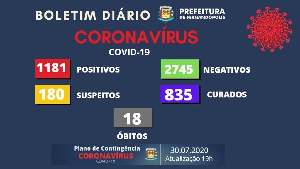 Por meio de um boletim sem informações adicionais, a Prefeitura de Fernandópolis, por meio da Secretaria de Saúde, divulgou o número de infectados no município no decorrer desta sexta-feira, 31 de julho.