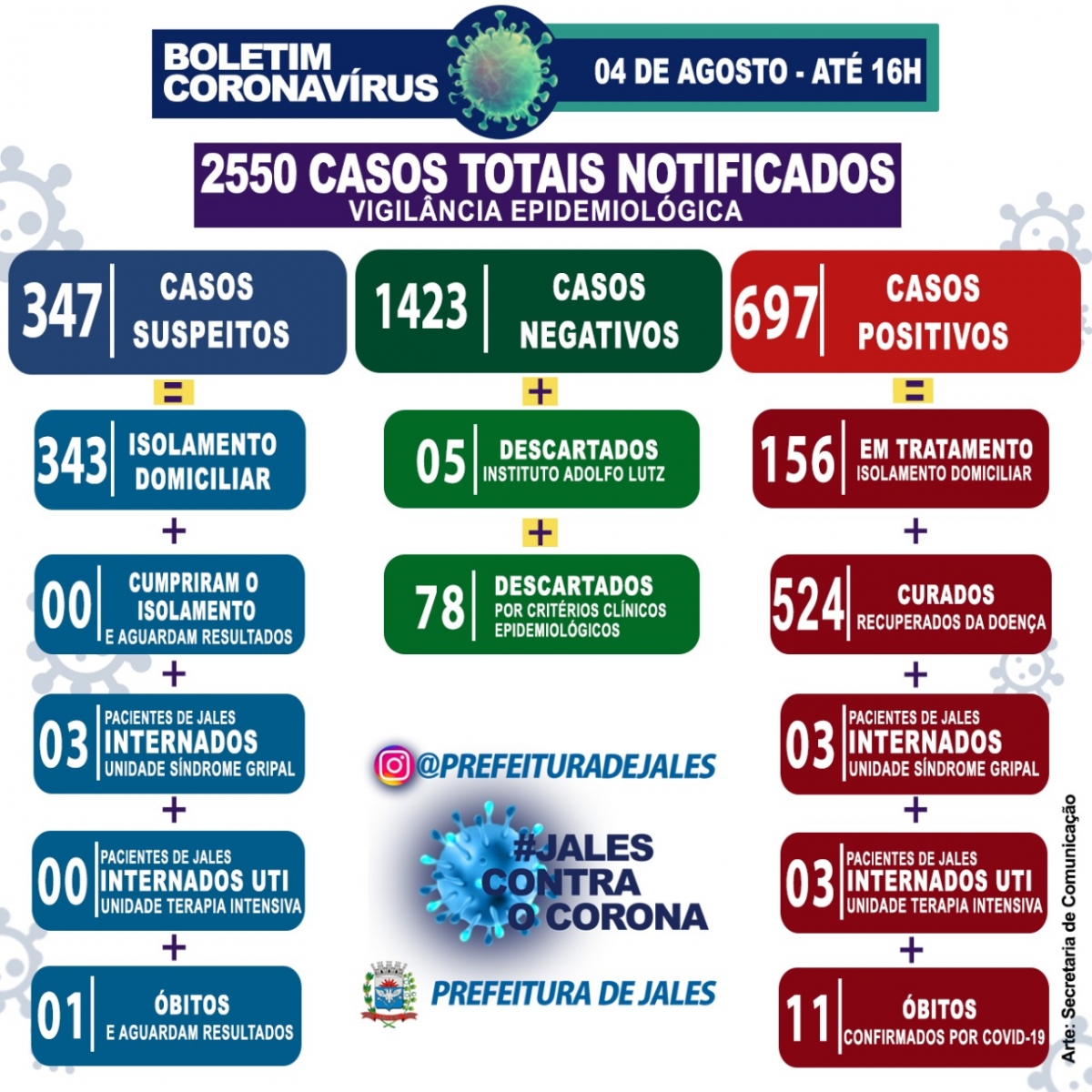A informação foi divulgada nesta terça-feira, 4, pela Vigilância Epidemiológica de Jales. A vítima é uma mulher de 95 anos que faleceu no período da manhã na UPA-24 horas município. Ainda segundo a vigilância, 47 pessoas testaram positivo para o novo coronavírus. Entre os infectados estão duas meninas, uma ainda bebê de 10 meses e a outra de quatro anos de idade.