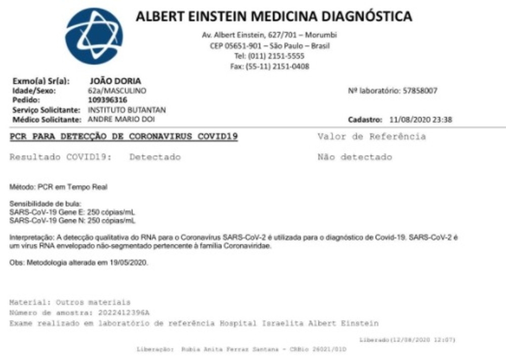 O governador de São Paulo, João Doria afirmou nesta quarta-feira, 12, que testou positivo para a Covid-19. Ele é o 11º governador a testar positivo para a doença no país. Doria, que tem 62 anos de idade, e, portanto, faz parte do grupo de risco para a doença, disse que não tem sintomas e se sente bem.