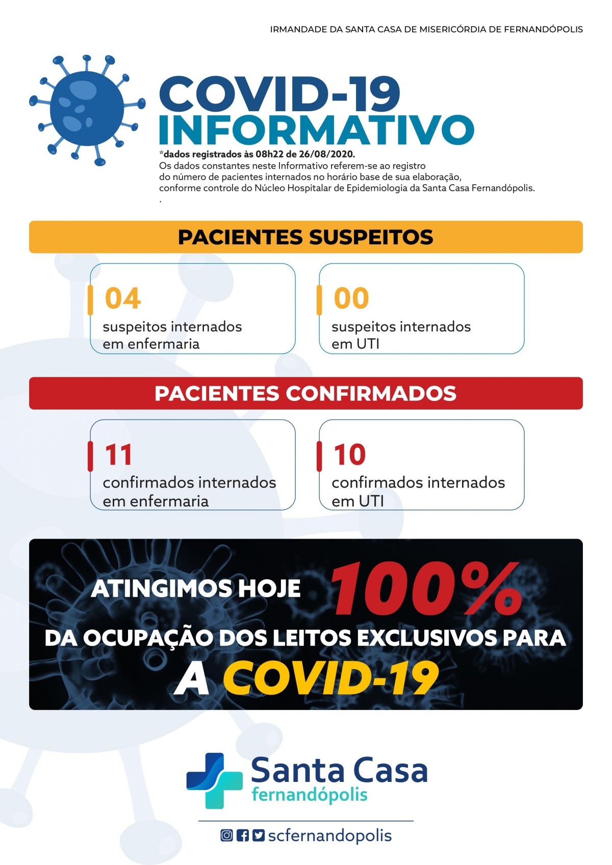 Na UTI, a situação é complicada e agora está com 10 pacientes internados, sendo que oito deles já testaram positivo para o novo coronavírus. A próxima atualização deve ocorrer na manhã desta terça-feira, 25 de agosto.