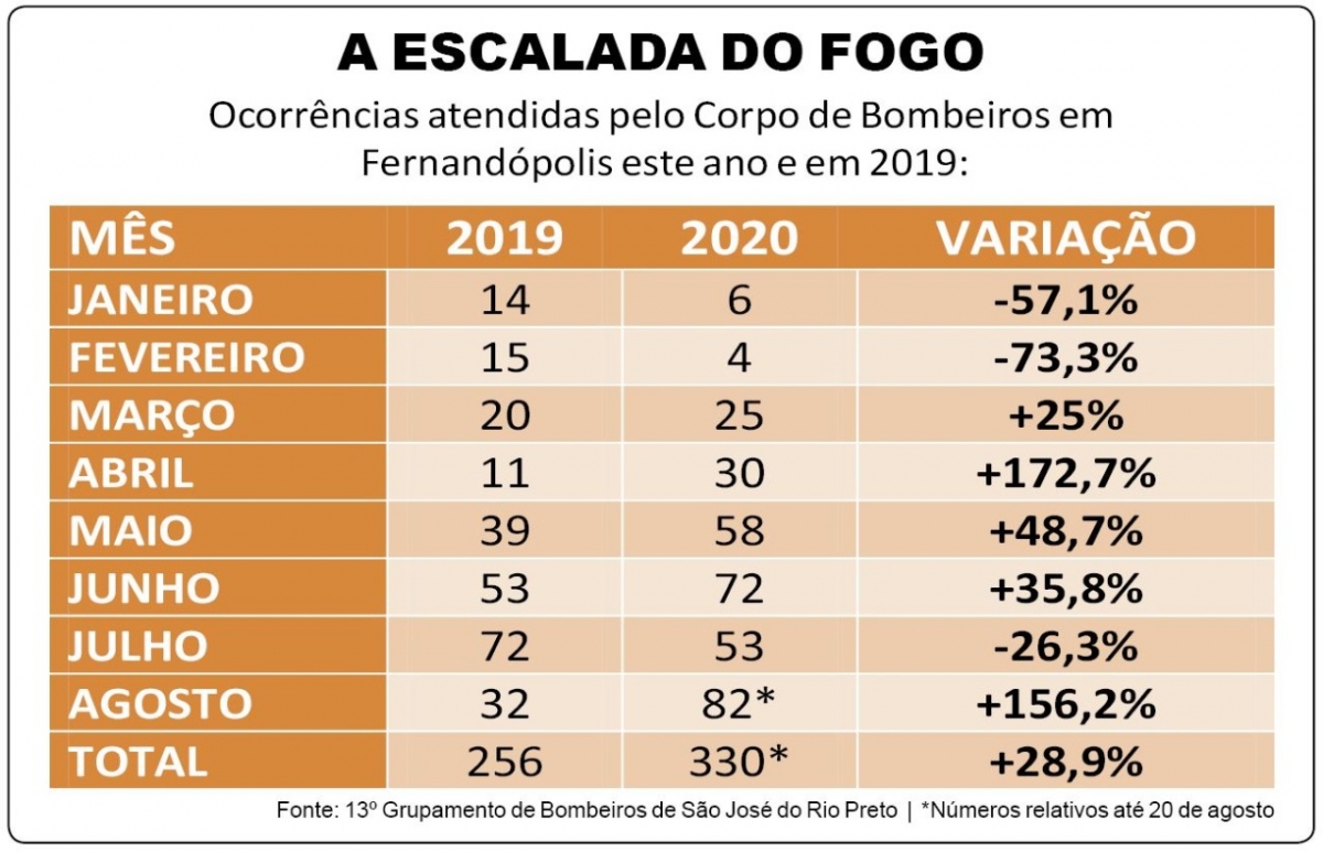 De acordo com dados divulgados pela Seção de Comunicação Social do 13º Grupamento de Bombeiros de São José do Rio Preto, a pedido de CIDADÃO, o número de queimadas em vegetação natural, cultivada, terrenos baldios e ponto de apoio, até o dia 20 de agosto era de 82 ocorrências atendidas pelo 3º Subgrupamento de Fernandópolis. Esse número é 156% maior que o registado em agosto de 2019, quando o número de queimadas chegou a 32.
