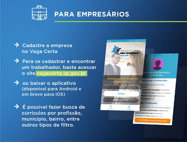 Vaga Certa é uma plataforma online lançada pelo Governo de São Paulo e reúne informações de trabalhadores, facilitando a pesquisa de currículos. Ela está disponível para trabalhadores e empregadores, podendo ser acessada pelo endereço eletrônico vagacerta.sp.gov.br/