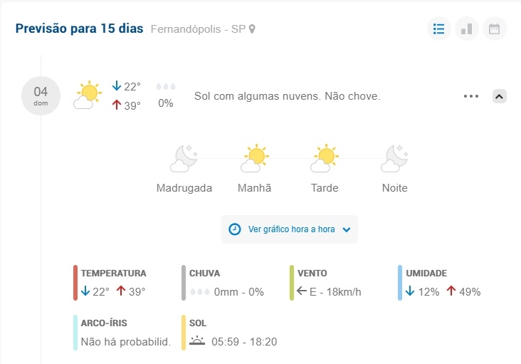 De acordo com a previsão do tempo do site Climatempo, Fernandópolis deve ter mais um final de semana escaldante. A previsão para o próximo sábado, 10, é de mínima de 27º e máxima de 43º graus.