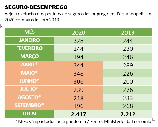 Comparando o período de abril a setembro, sob o efeito da pandemia, o número de requerimentos de seguro desemprego em Fernandópolis foi de 1.651, contra 1.492, em igual período do ano passado. Isso representa um aumento de pedidos este ano, da ordem de 10%.