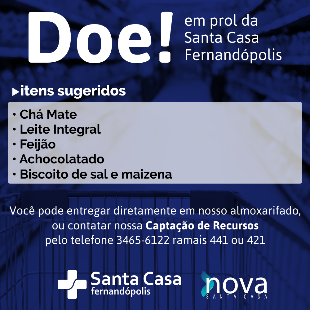 A Santa Casa de Fernandópolis está direcionando suas campanhas para o recebimento de doações de leite, cuja utilização diária atinge a média de aproximadamente 70 litros. Entretanto. O Hospital ressalta ainda que outros alimentos não perecíveis tais como bolachas, biscoitos, amido de milho, chá mate, feijão e achocolatados também podem ser doados.