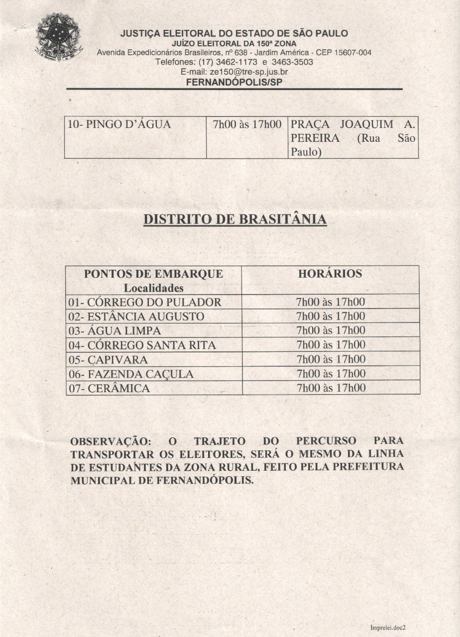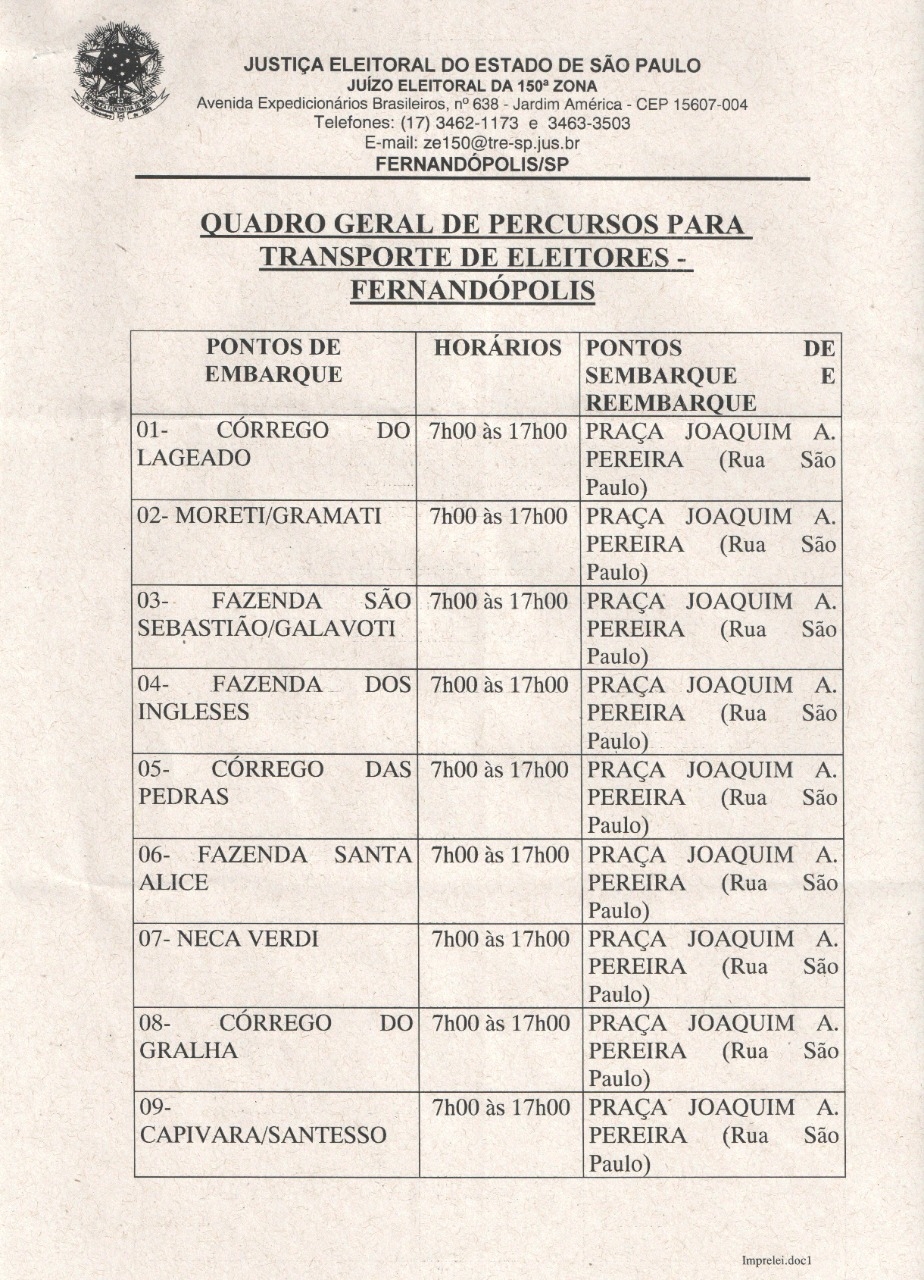 A Juiz da 150ª Zona Eleitoral de Fernandópolis, Vinicius Castrequini Buffulin, definiu através de edital que o transporte de eleitores da zona rural só pode ser realizado por veículos oficiais com a tarja “A Serviço da Justiça Eleitoral”.