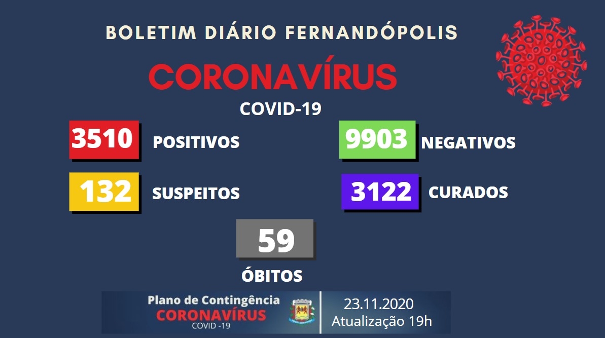 De acordo com o boletim epidemiológico desta segunda-feira, 23, divulgado pela Prefeitura de Fernandópolis, mais 34 pessoas testaram positivo para a doença, totalizando 3.510 pessoas infectadas.