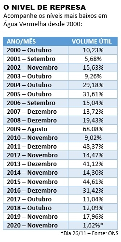 O solo rachado, onde antes era um mar de água, expõe a situação dramática do nível do reservatório da Usina de Água Vermelha na região. Esta semana, o reservatório atingiu seu pior nível desde que o ONS – Operador Nacional do Sistema – a partir do apagão de 2000, começou a fazer o acompanhamento diário do nível de todos os reservatórios de hidrelétricas pelo Brasil. Na quinta-feira, 26, o boletim do ONS indicava que o reservatório estava com apenas 1,62% do seu volume útil, superando setembro de 2001, quando o índice chegou a 5,68% (veja quadro).