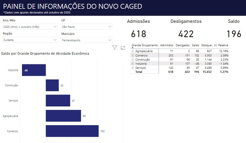 Os números do Caged, divulgados nesta quinta-feira, 26, mostram que em outubro, foram abertos 618 empregos formais em Fernandópolis. O número de desligamentos ficou em 422, o que gerou um saldo positivo de 196 vagas abertas.