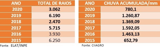 A relação entre chuvas e raios nem sempre está relacionada. Chover mais, ou menos, não significa mais ou menos raios (veja o comparativo nos quadros). Contudo, em 2020, essa relação, menos chuva, menos raios, funcionou.