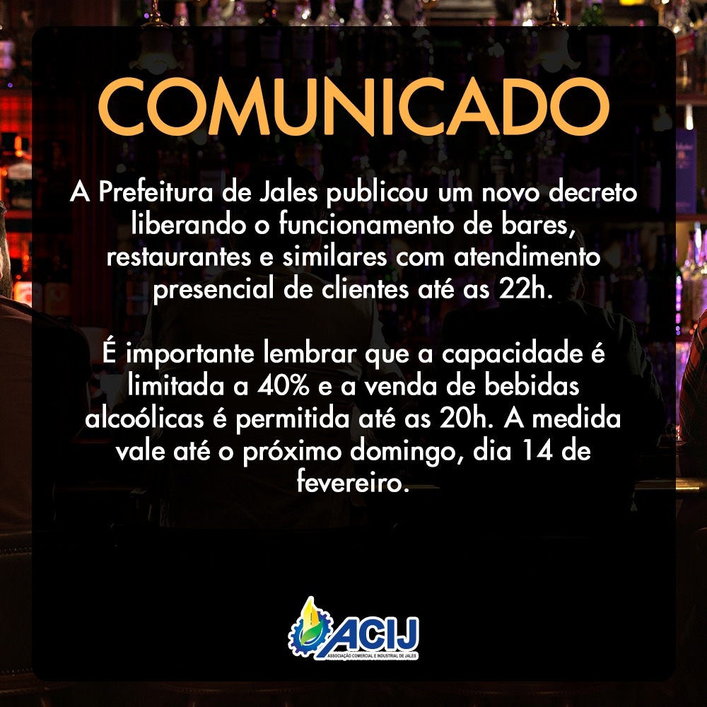 A Prefeitura de Jales publicou um novo decreto na noite desta terça-feira, 9, liberando o funcionamento de bares, restaurantes, lanchonetes e similares com atendimento presencial de clientes até as 22h.