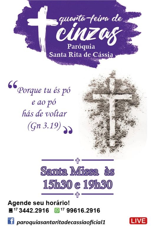 Com duas missas programadas para as 15h30 e 19h30, a Igreja Matriz Santa Rita de Cássia celebra a “Quarta-Feira de Cinzas” que abre o período da quaresma e lança a campanha da Fraternidade 2021. Por conta da pandemia, os fiéis devem agendar participação nas missas já que o público é limitado.