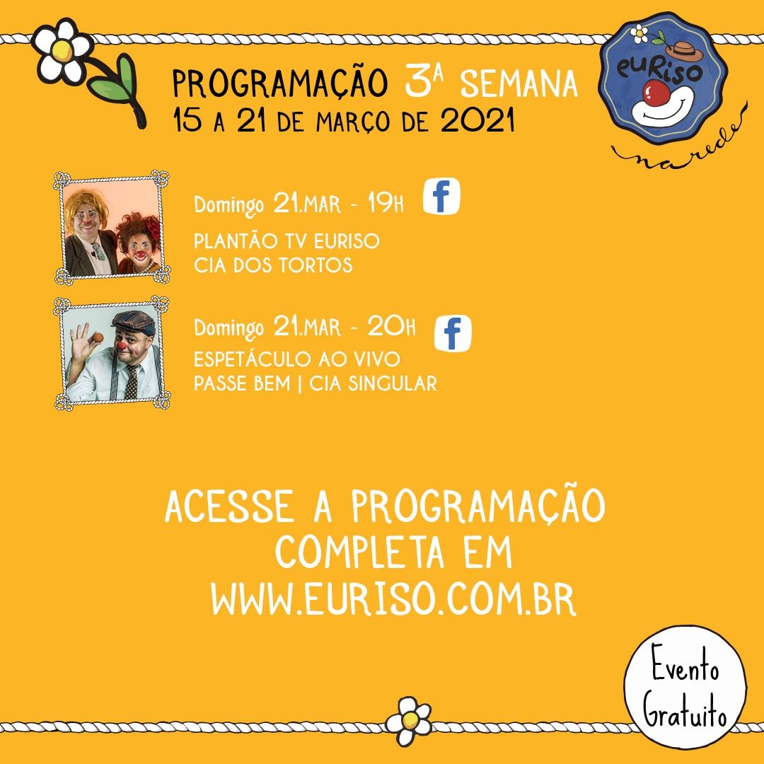 Ambos espetáculos serão precedidos da apresentação da “TV EuRiso”, comandada pela Cia dos Tortos, à partir das 19h. A programação é gratuita e a agenda está disponível no site do “EuRiso na Rede” (www.euriso.com.br) e pelas páginas oficiais no Facebook, YouTube, Instagram ou Sympla.