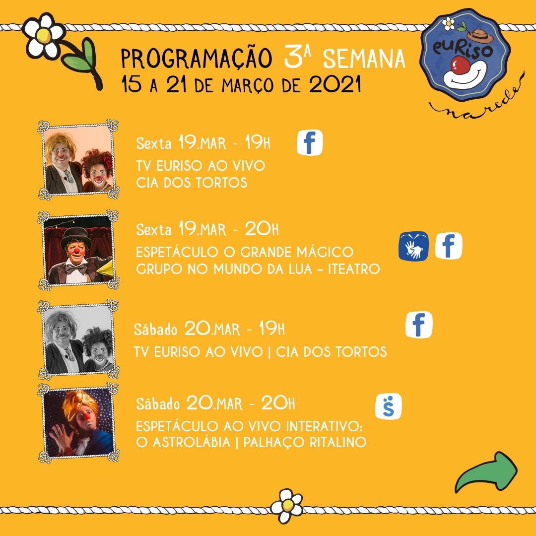 O “EuRiso na Rede – Encontro Internacional de Palhaços Online” terá grandes atrações para este sábado e domingo, dias 20 e 21 de março. As apresentações envolvem artistas e companhias de todo o Brasil, com transmissão gratuita pela internet.