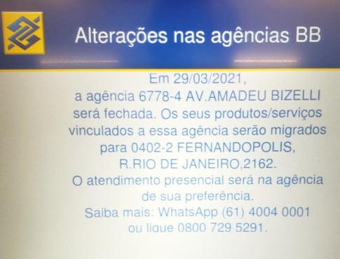 Uma dessas agências que serão desativas é de Fernandópolis está localizada na Avenida Amadeu Bizelli. Como a migração já está em andamento, alguns clientes da agência têm relatado a ausência de informações para aprofundadas sobre esse processo. O CIDADÃO entrou em contato com o Banco do Brasil em Brasília por meio de uma das centrais criadas para tratar exclusivamente dessa questão. Em entrevista, o banco informou que colocou vários canais de comunicação a serviço dos clientes como canais do 0800, aplicativo, site e SMS.