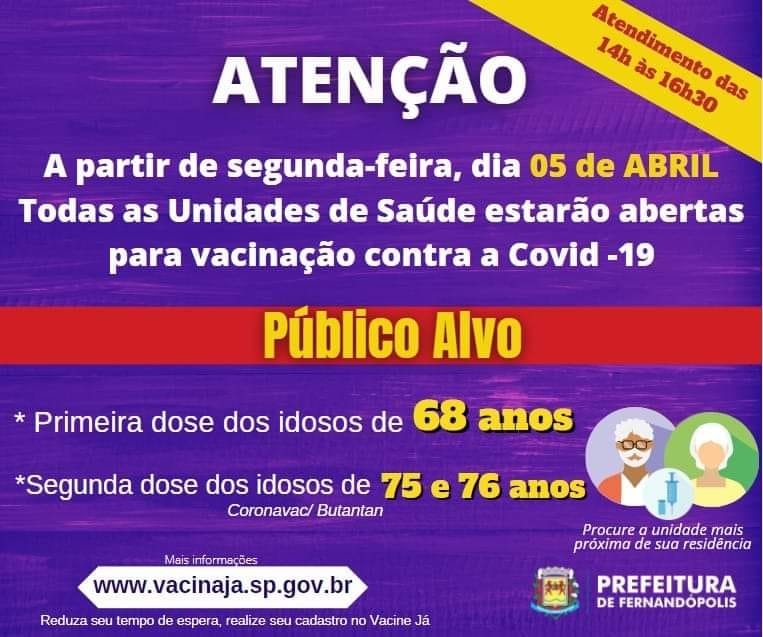 Já com relação ao grupo de idosos de 68 anos que receberão a primeira dose do imunizante, segue o cronograma de vacinação adotado pela Prefeitura de Fernandópolis. Nesta segunda-feira, o cronograma inclui também a segunda dose para idosos de 75 e 76 anos de idade.
