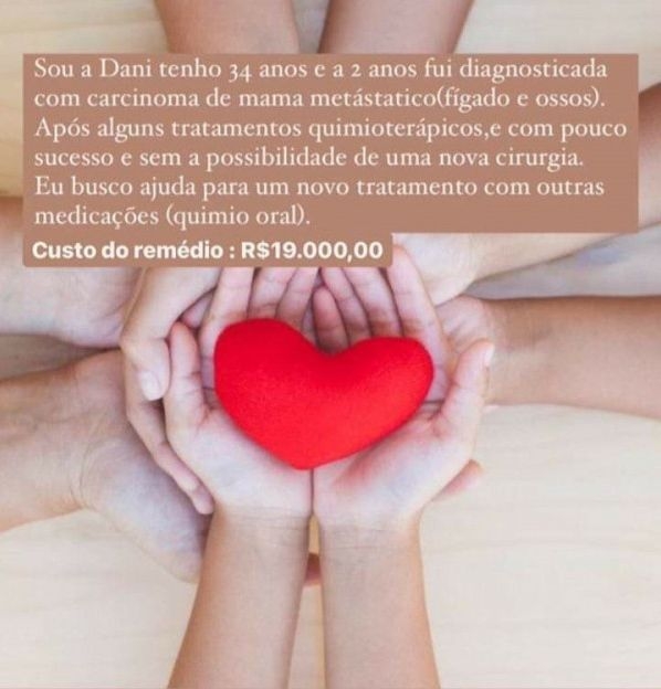 Diagnosticada há cerca de 2 anos, após alguns tratamentos quimioterápicos sem sucesso e sem possibilidade de outra cirurgia, Dani busca por ajuda para um novo tratamento com uma nova medicação (químio oral).
