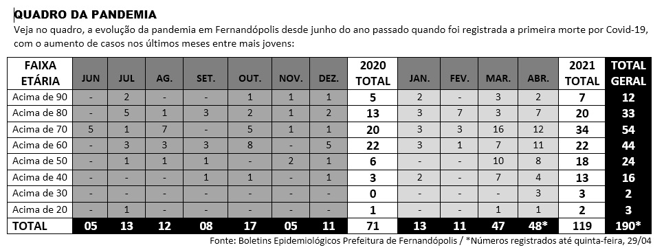 Na semana que o Brasil atingiu a marca de 400 mil mortes pela Covid-19, Fernandópolis também registrou uma triste marca: as 95 mortes registradas nos meses de março e abril, representam 50% do total de óbitos desde o início da pandemia em março do ano passado. E mesmo registrando nas duas últimas semanas queda nos índices de novos casos, internados e mortes, abril assumiu a posição de mês mais letal da pandemia, superando o mês de março.