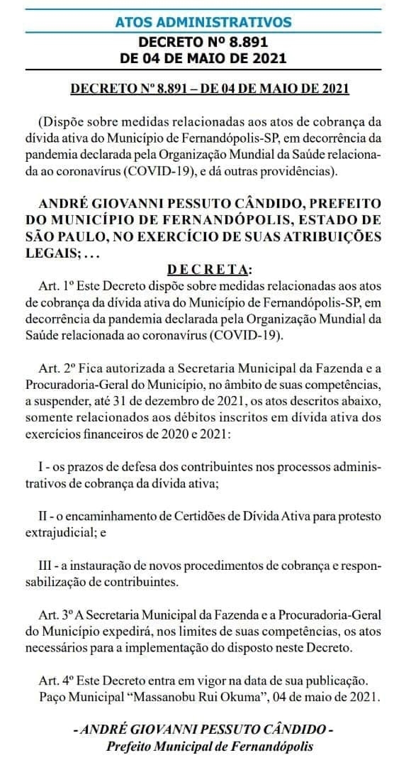 O prefeito André Pessuto (DEM) assinou decreto suspendendo temporariamente, a cobrança da dívida ativa. O decreto foi publicado no Diário Oficial Eletrônico nesta quarta-feira, 5.