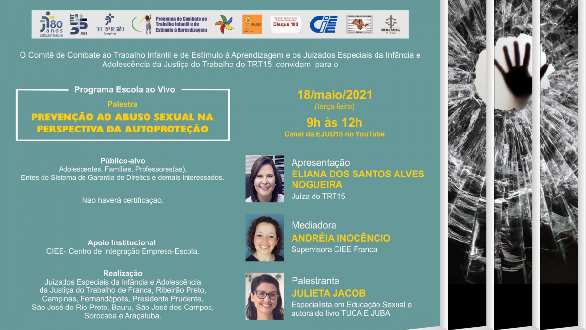 O Comitê de Combate ao Trabalho Infantil e de Estímulo à Aprendizagem e os Juizados Especiais da Infância e Adolescência da Justiça do Trabalho da 15ª Região agendaram para o dia 18 de maio, terça-feira, das 9 às 12 horas, oficina para tratar do tema "Prevenção ao abuso sexual na perspectiva da autoproteção".