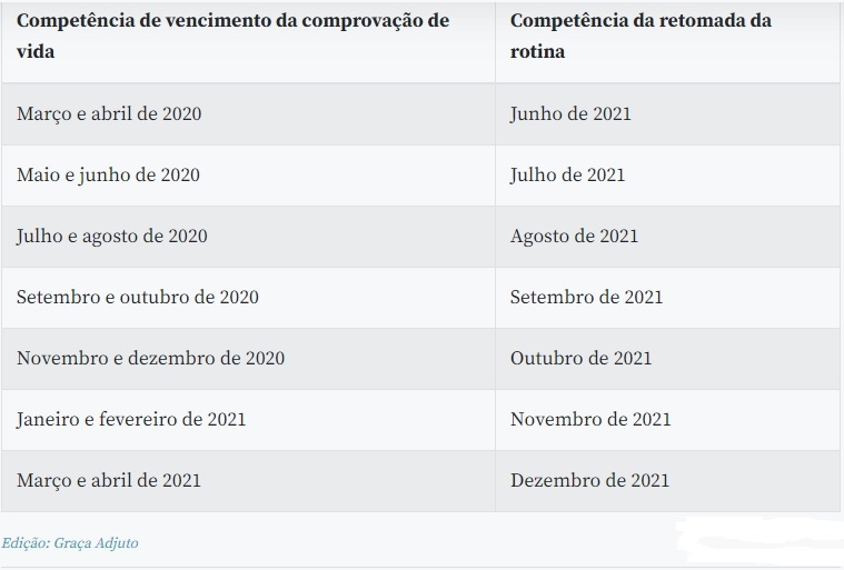 Para evitar aglomerações nas agências, o INSS elaborou um calendário. O cronograma começa em junho para quem deveria ter feito a prova de vida em março e abril de 2020. No mês seguinte, julho, para os beneficiários que deveriam ter feito a prova de vida em maio e junho. O calendário segue até dezembro com a prova de vida para quem deveria ter feito em março e abril de 2021.