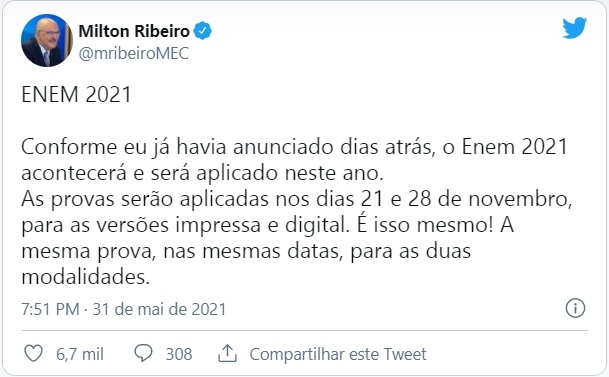 "Conforme eu já havia anunciado dias atrás, o Enem 2021 acontecerá e será aplicado neste ano. As provas serão aplicadas nos dias 21 e 28 de novembro, para as versões impressa e digital. É isso mesmo! A mesma prova, nas mesmas datas, para as duas modalidades", postou o ministro na rede social.