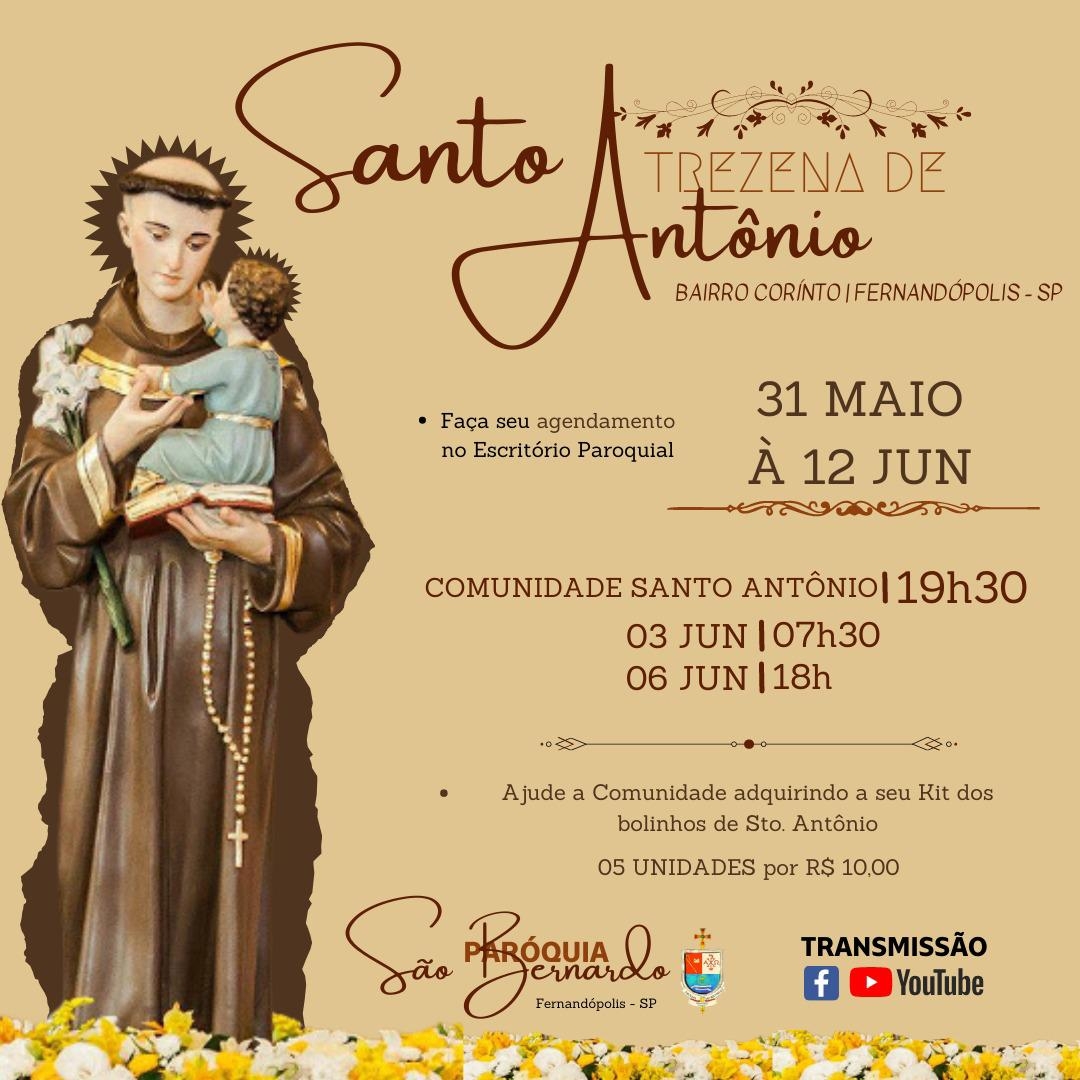 A Comunidade Santo Antônio de Fernandópolis, localizada no bairro Corinto, iniciou no último dia 31 de maio a ‘Trezena de Santo Antônio’. Trata-se de um período de 13 dias que antecede o dia do santo padroeiro com celebrações especiais. A igreja pertence à Paróquia São Bernardo.
