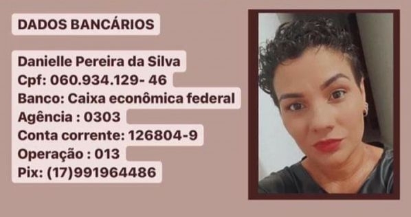 As contribuições podem ser feitas por depósito em nome de Danielle Pereira da Silva, CPF 060.934.129-46, Caixa Econômica Federal, agência 0303, conta corrente 126804-9 operação 013 ou pelo PIX 17991964486 ou também pelo site da ‘Vakinha’.