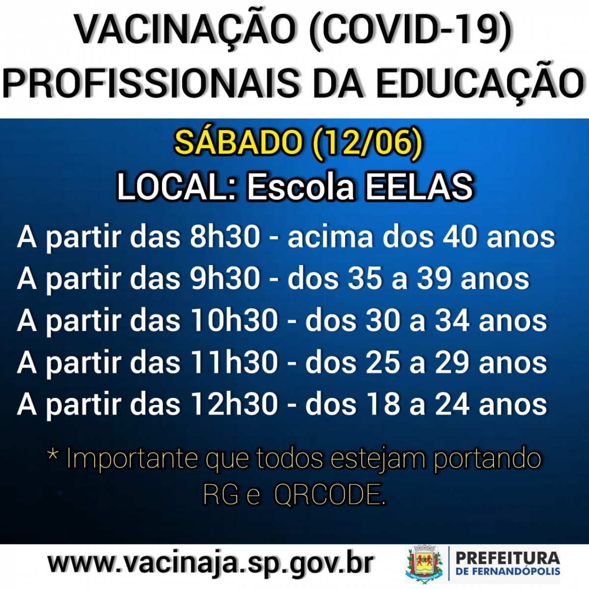 Fernandópolis inicia neste sábado,12, a imunização contra Covid-19 dos profissionais da educação que tenham 18 anos ou mais. A vacinação acontece a partir das 08h30 na Escola Estadual Líbero de Almeida Silvares – EELAS – com horários específicos para cada faixa etária, conforme cronograma abaixo.