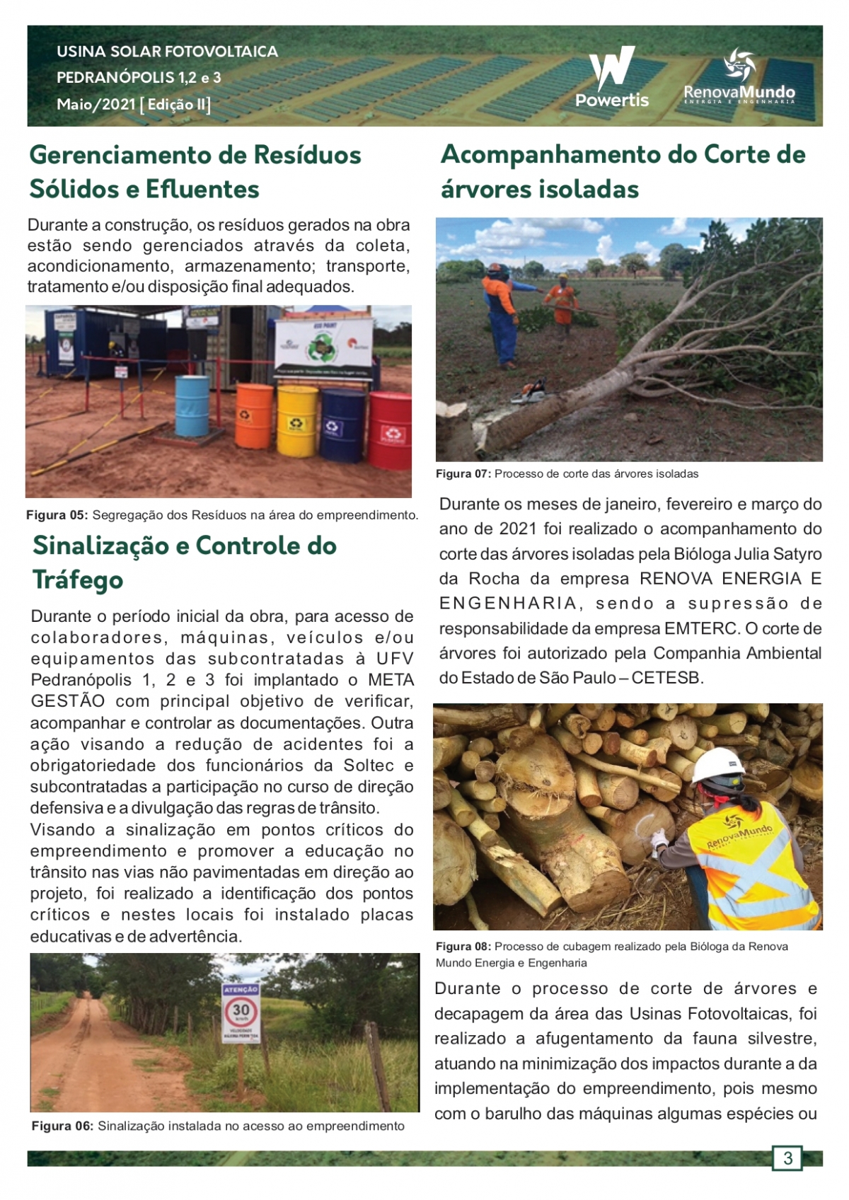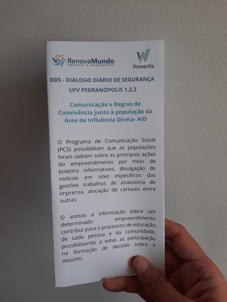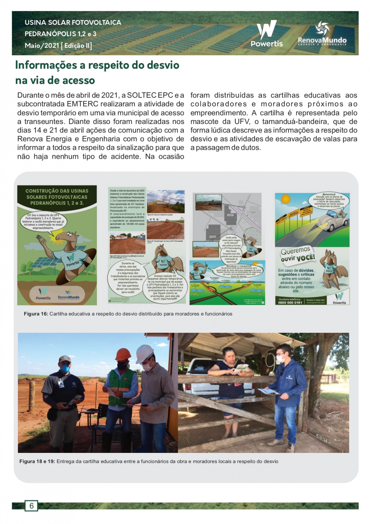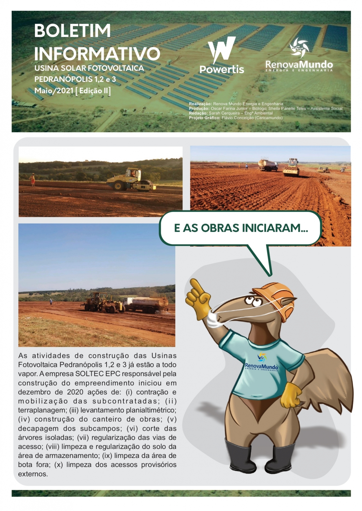 No período de 18 a 26 de maio de 2021 a Renova Mundo Energia e Engenharia Ltda. em parceria com a empresa POWERTIS realizou a 2ª Campanha referente aos Programas de Educação Ambiental e Comunicação Social nas áreas de influência da USINA SOLAR FOTOVOLTAICA PEDRANÓPOLIS 1, 2 e 3.