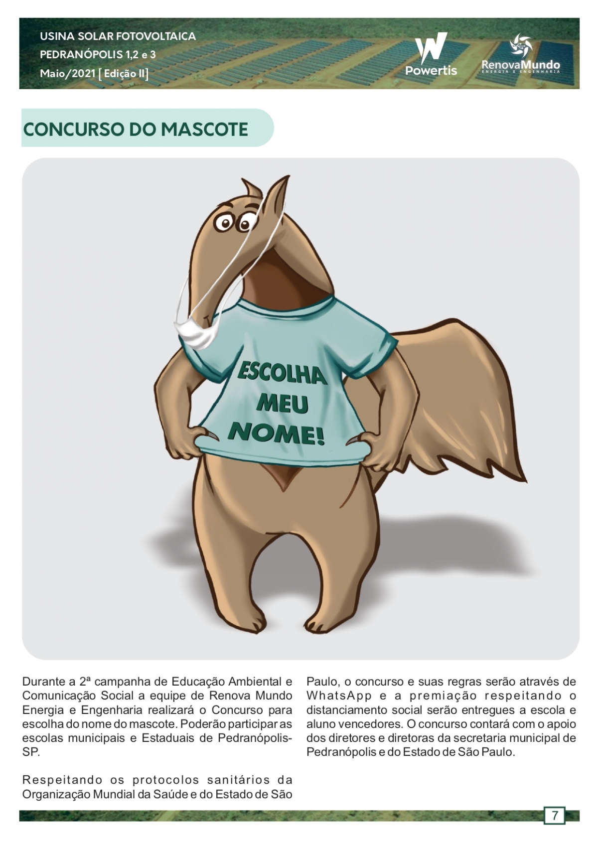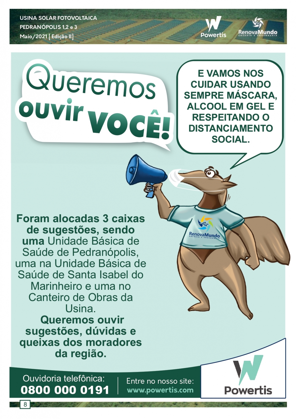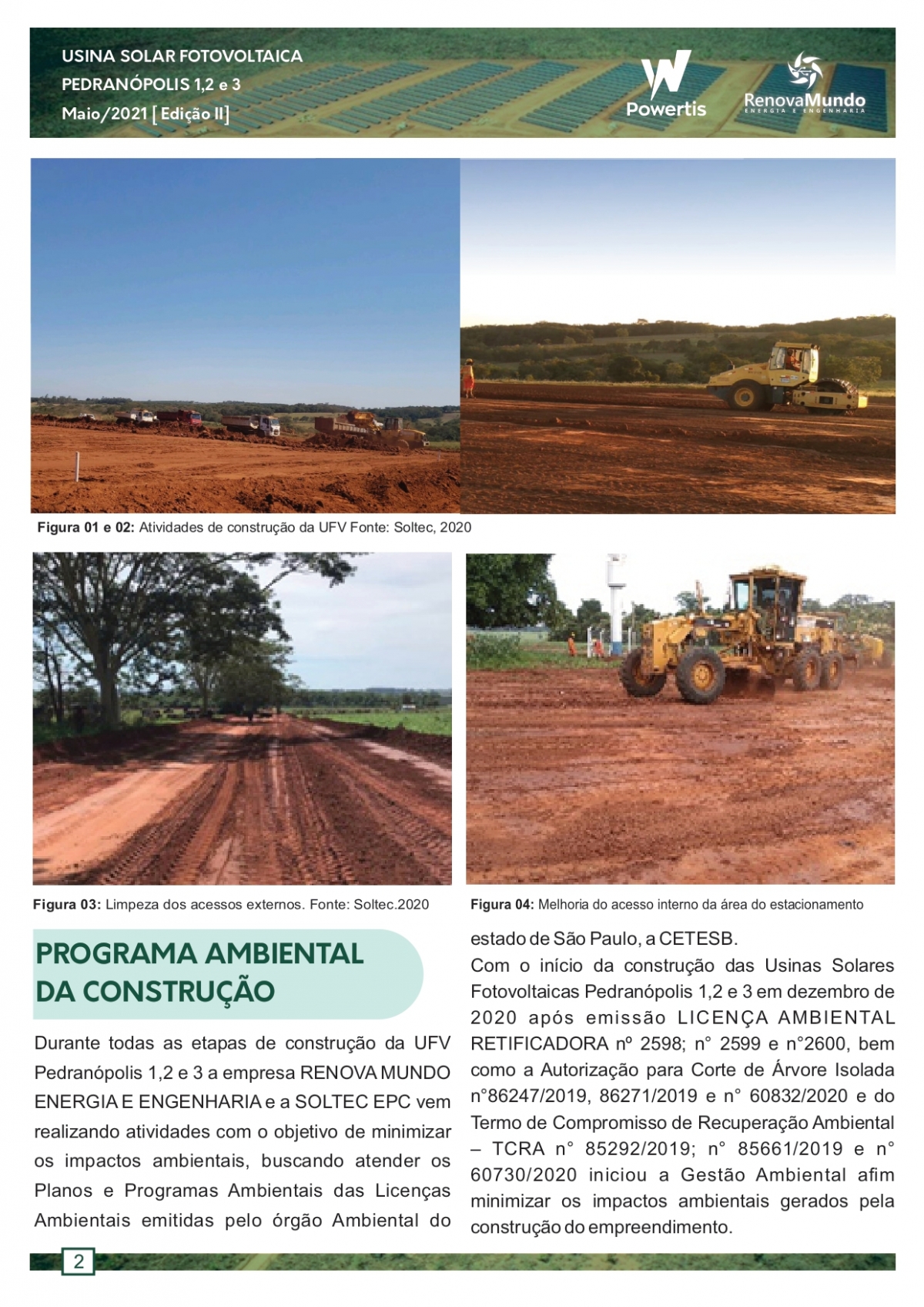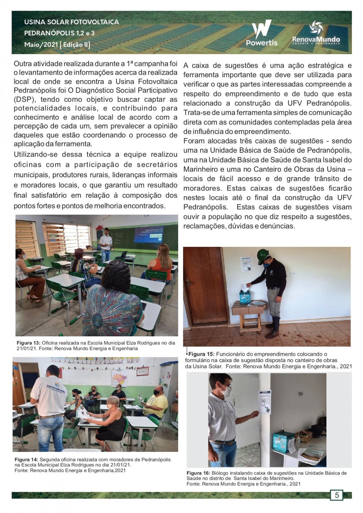 No período de 18 a 26 de maio de 2021 a Renova Mundo Energia e Engenharia Ltda. em parceria com a empresa POWERTIS realizou a 2ª Campanha referente aos Programas de Educação Ambiental e Comunicação Social nas áreas de influência da USINA SOLAR FOTOVOLTAICA PEDRANÓPOLIS 1, 2 e 3.