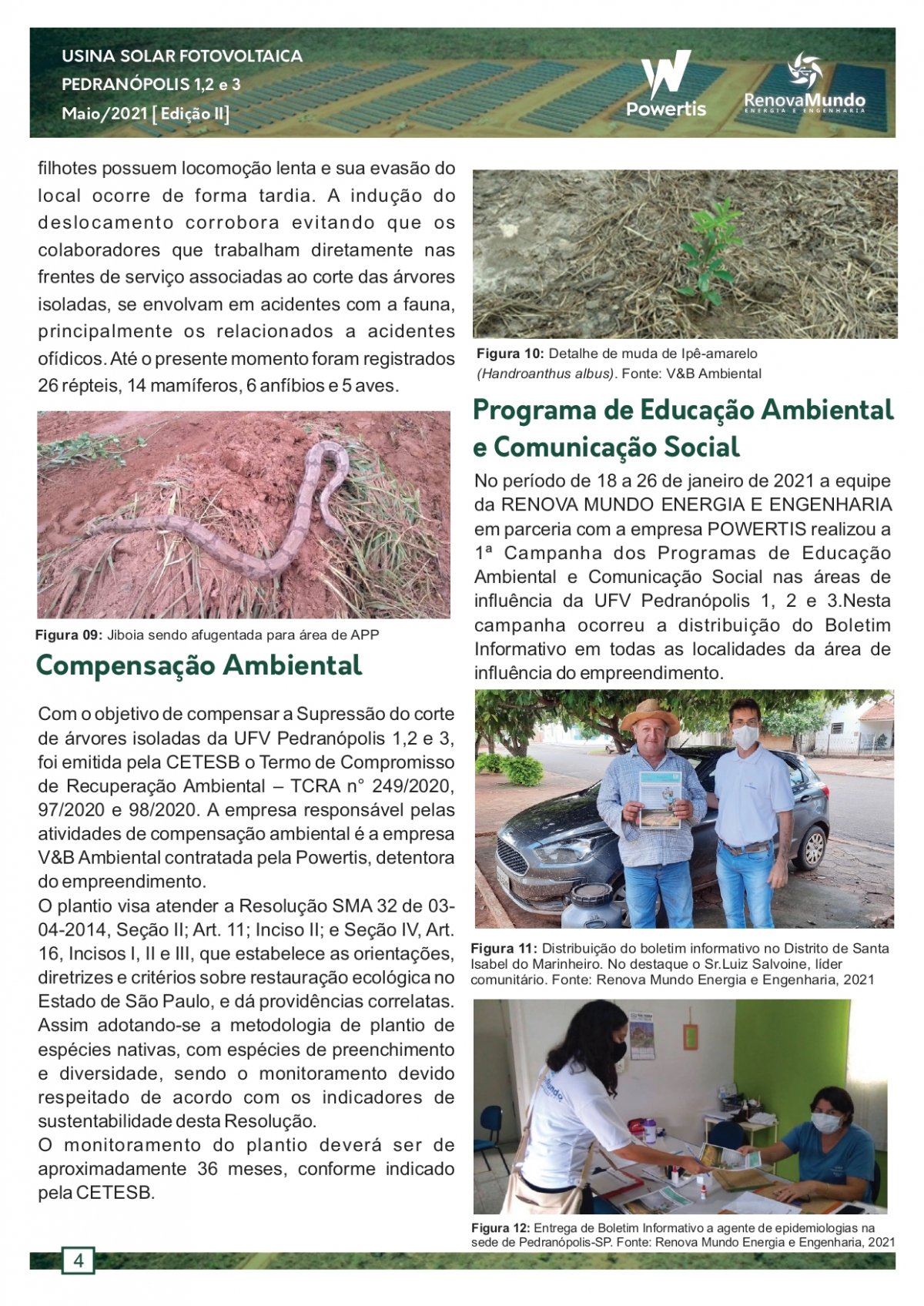 Durante todo o período da campanha, foram distribuídos o Boletim Informativo - mais um canal de comunicação aberto com a comunidade, a fim de informar os moradores e trabalhadores a respeito do início das obras e outras atividades que serão executadas durante o período de construção da Usina Fotovoltaica, assim como as ações, os programas ambientais em desenvolvimento.