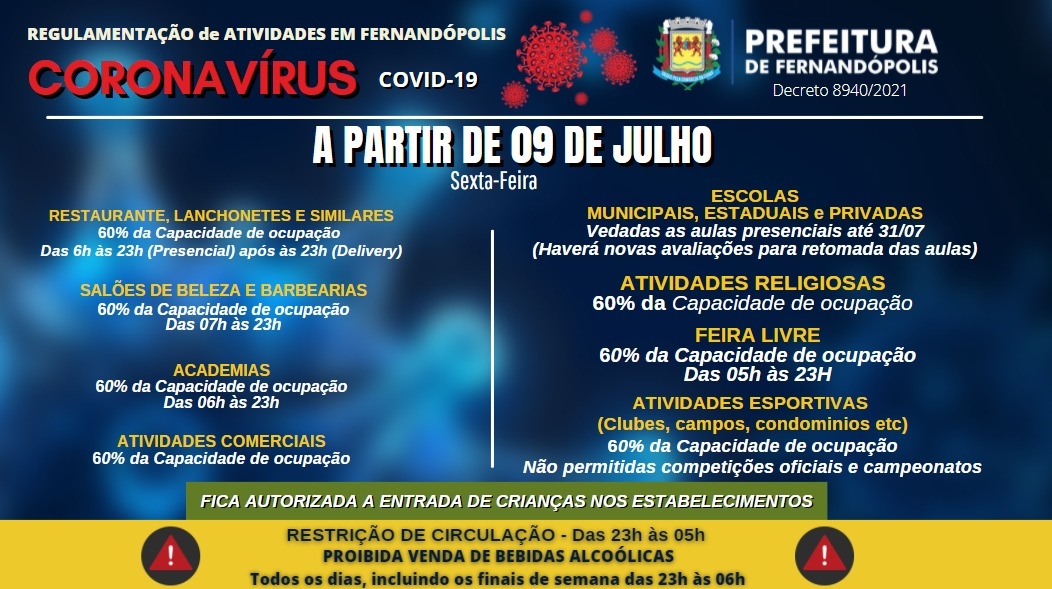 Um novo decreto que será publicado em edição extraordinária na tarde de hoje, 08, pela prefeitura de Fernandópolis, irá suspender a medida de restrição de circulação de crianças até 12 anos, que estava em vigor desde o dia 17 de junho.