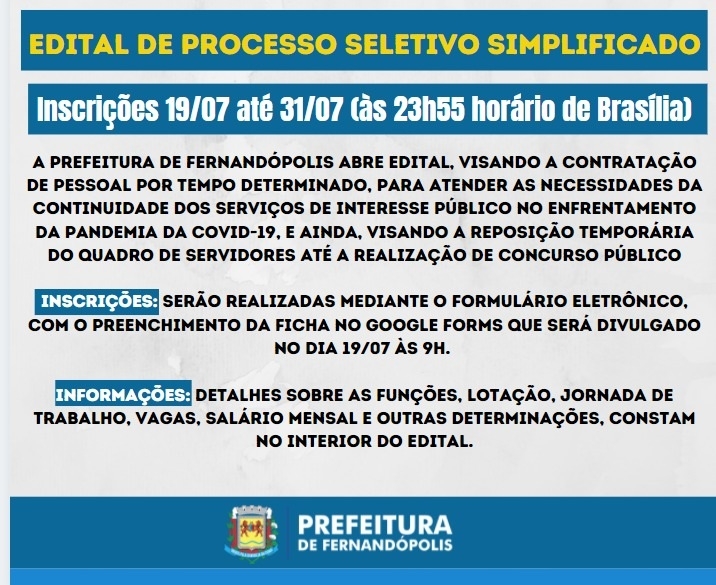 A prefeitura de Fernandópolis divulgou nota nesta segunda-feira, 12, informando que vai abrir na próxima semana processo seletivo simplificado destinado ao preenchimento de oito cargos, incluindo médico, psicólogo, assistente social, farmacêutico, enfermeiro, fisioterapeuta, técnico de Enfermagem e auxiliar de Saúde Bucal.. De acordo com a nota, o processo visa a contratação de pessoal por tempo determinado, para atender as necessidades da continuidade dos serviços de interesse público no enfrentamento da pandemia da Covid-19.