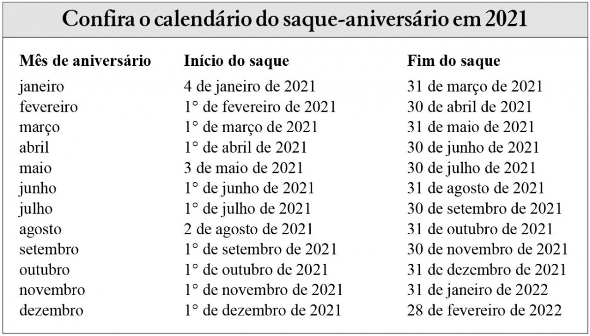 O saque-aniversário 2021 já começou. Nascidos em janeiro, fevereiro, março e abril que optarem pela modalidade neste ano só receberão a primeira parcela em 2022.