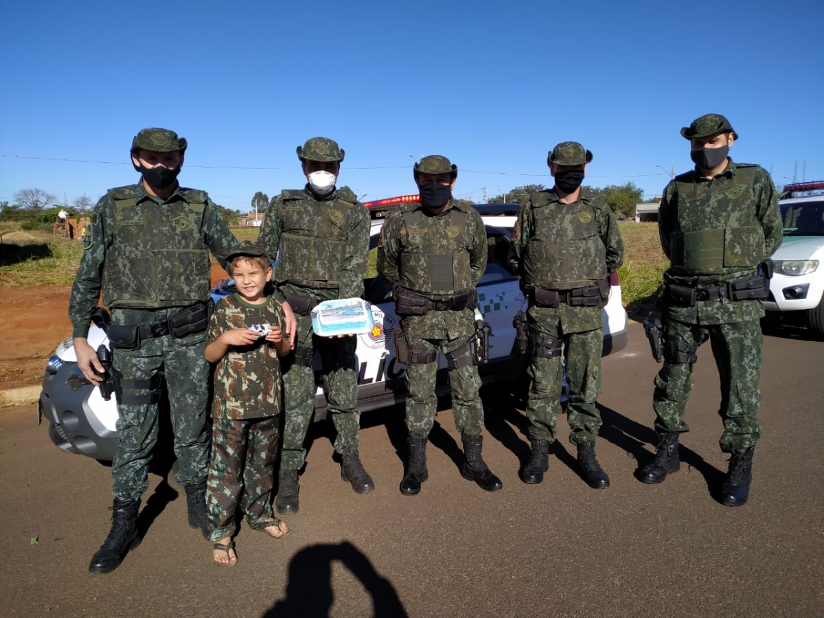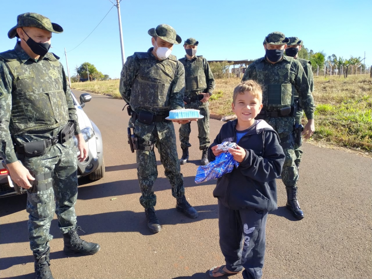 O fato ocorreu no bairro Monte Verde em Urânia, onde Yago mora com a família. Os policiais militares ambientais foram até a residência do menino e o presentearam com um bolo personalizado, uma camioneta miniatura da Polícia Ambiental e uma farda, simbolizando a Instituição. A surpresa teve direito ao corte do bolo personalizado e, claro, parabéns a você. Yago vestiu a farda que ganhou de presente e deu uma volta na viatura policial.