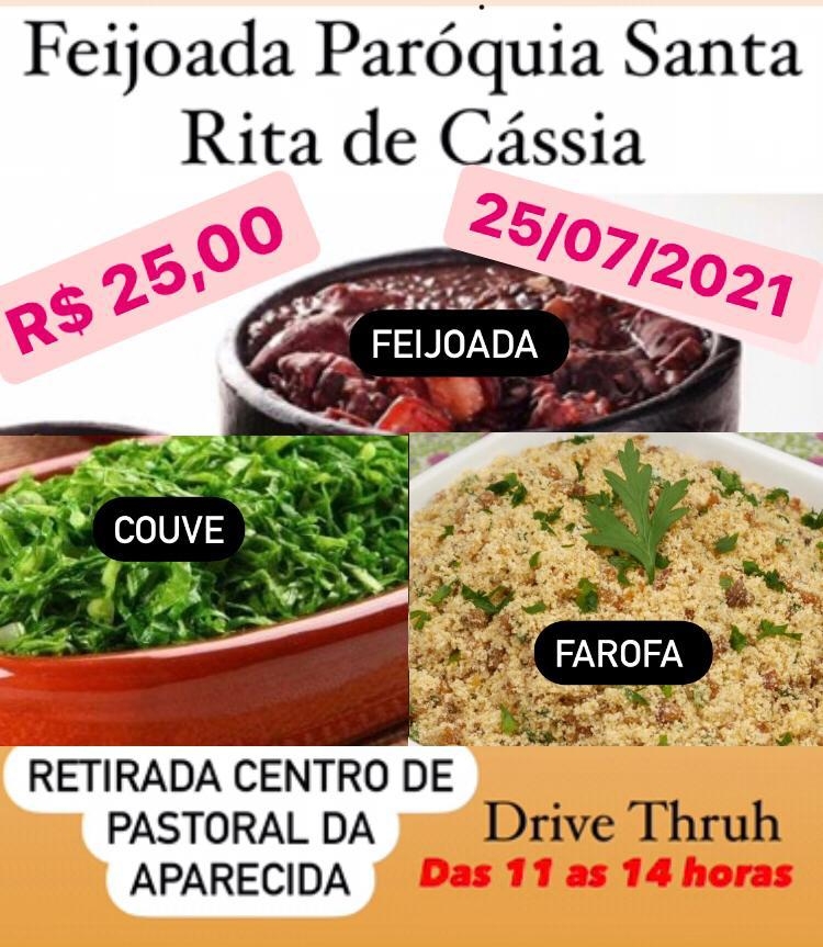 A Festa do Dia dos Motoristas coincide este ano com a realização da tradicional Feijoada na Paróquia Santa Rita. Os convites ainda podem ser adquiridos com voluntários ou na Secretaria Paroquial ao preço de R$ 25. O kit com feijoada, couve e farofa será entregue neste domingo das 11 às 14 horas no sistema drive thru no Centro Pastoral da Aparecida.