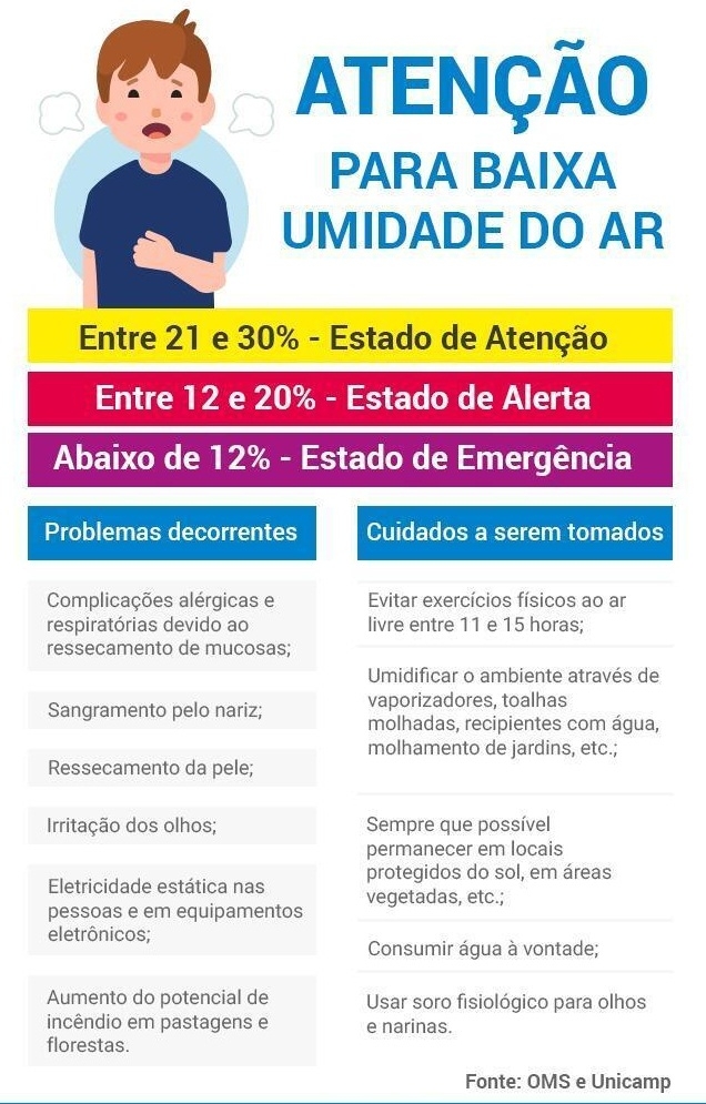 Já a umidade relativa do ar se mantém em queda. No domingo, chegou a 20% o que já representa estado de alerta com riscos para a saúde (veja abaixo).