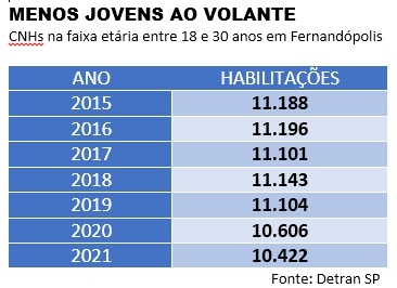 Dados divulgados pelo Detran SP mostram que houve uma redução de 11.188 pessoas habilitadas nessa faixa etária em junho de 2015 para 10.422 no mesmo período deste ano em Fernandópolis, uma queda de 6.8%, que é menor do que a registrada em São Paulo que foi de 10,5%.