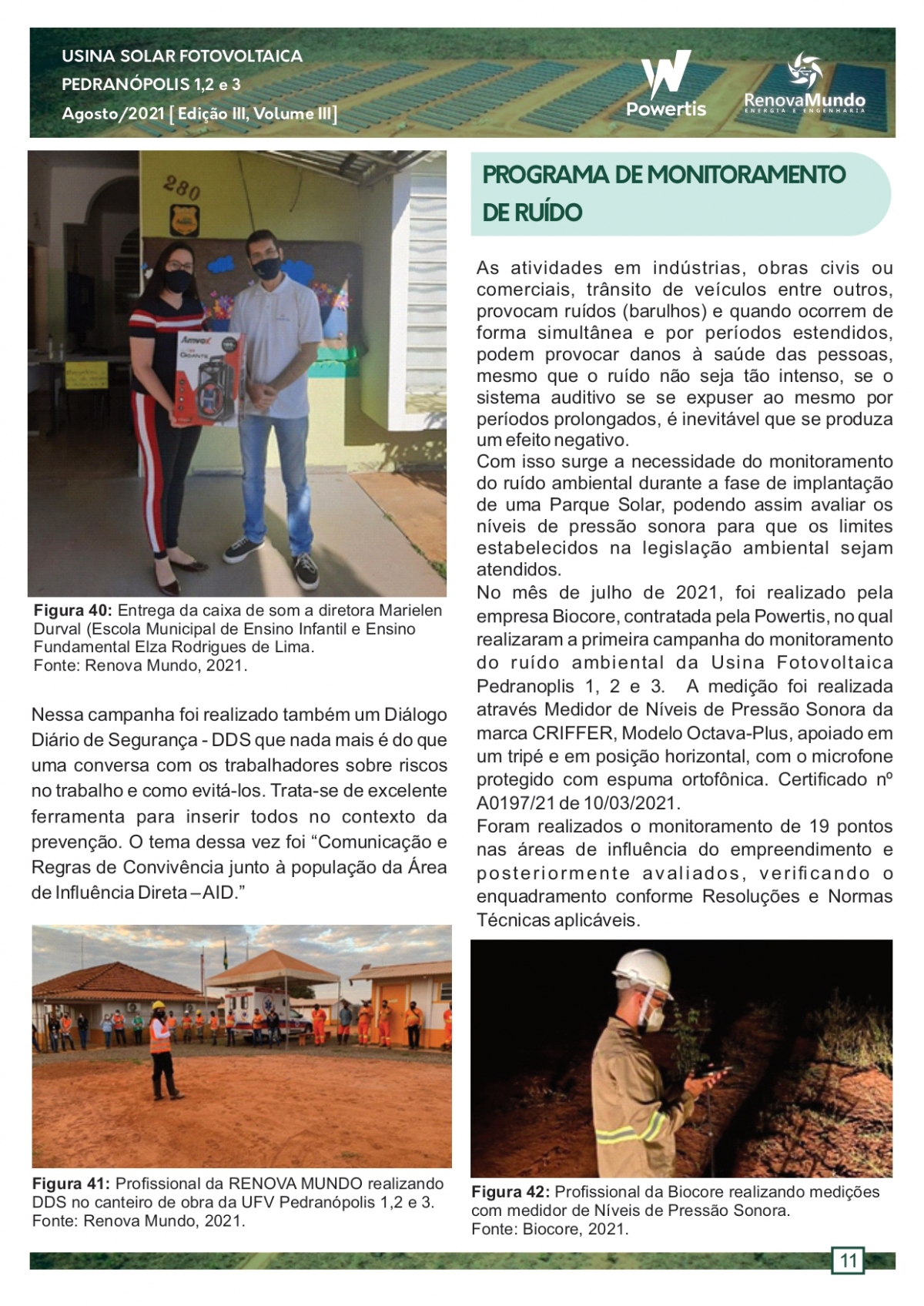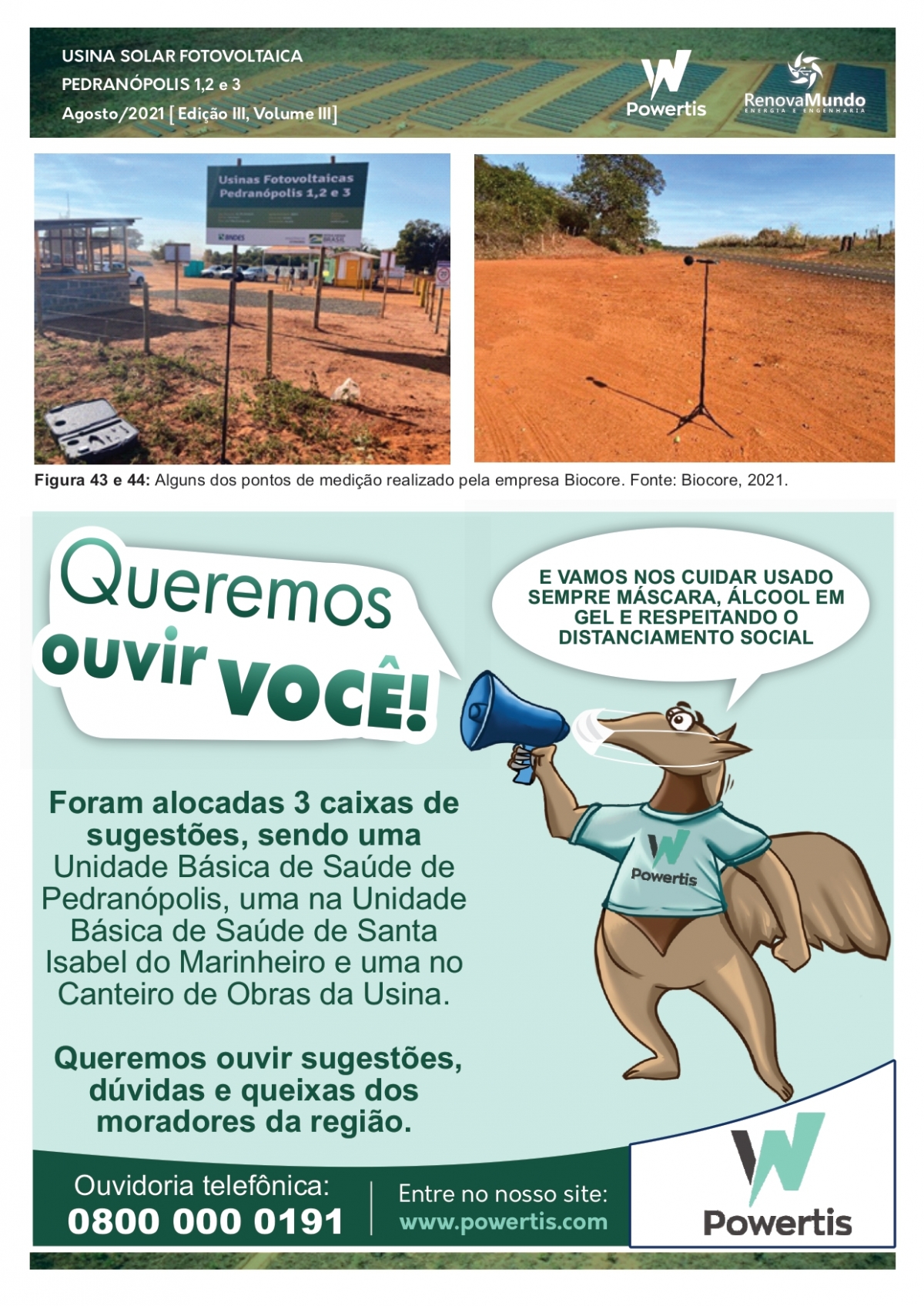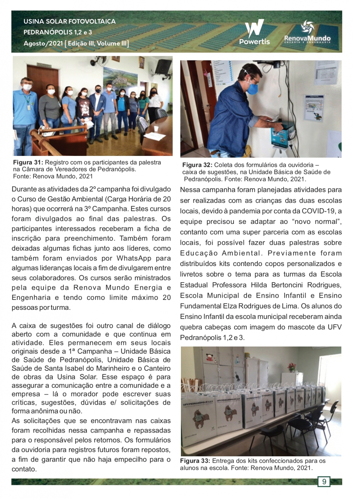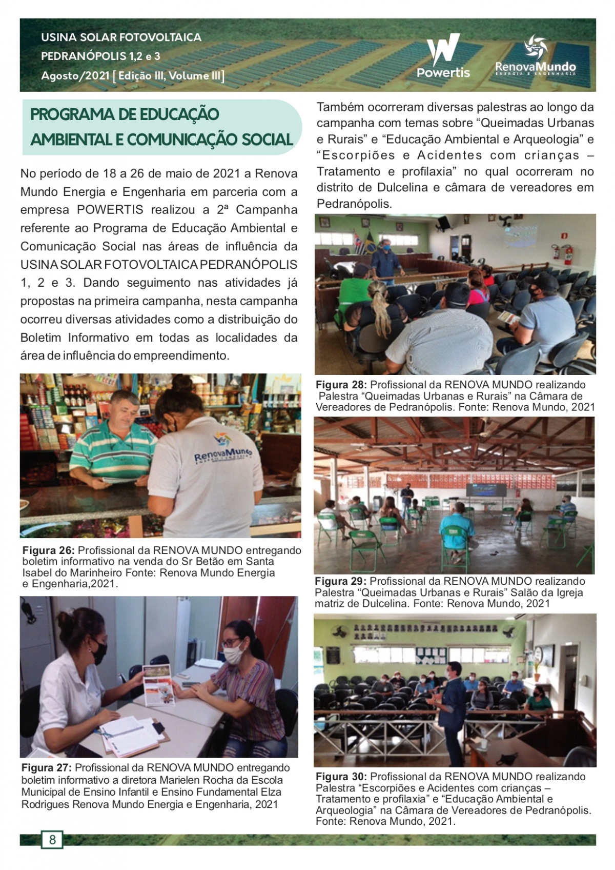 Com o andamento da obra e execução dos Planos e Programas Ambientais durante a construção do empreendimento, foi elaborada a terceira edição do Boletim Informativo (ANEXO) a respeito destas atividades, com o objetivo de promover a transparência e o diálogo entre as partes envolvidas. Foram distribuídos aproximadamente 400 boletins informativos na 3ª campanha em todas as atividades executadas pela Renova Mundo, aos dois distritos de Pedranópolis, Santa Isabel do Marinheiro e Dulcelina, bem como no canteiro de obras, no escritório central da Powertis (sede), zona rural e comunidades da área de influência do empreendimento. O material elaborado apresenta linguagem acessível, registros imagéticos seguindo o layout gráfico das campanhas prévias. Segue abaixo alguns registros de entregas de boletins informativos as comunidades locais.