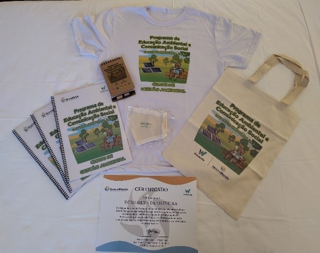 Foram entregues aos participantes um kit didático para auxilio durante o curso, contendo camisa do curso, apostila de estudo, caneta, caderno de anotações, máscara e ecobags. Ao final do foi entregue um certificado de participação.