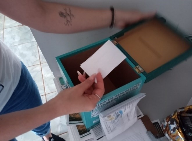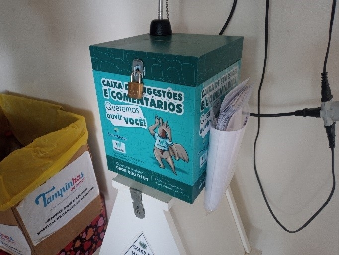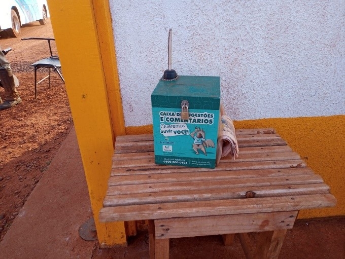A caixa de sugestões foi outro canal de diálogo aberto com a comunidade e que continua em atividade. Eles permanecem em seus locais originais desde a 1ª Campanha – Unidade Básica de Saúde de Pedranópolis, Unidade Básica de Saúde de Santa Isabel do Marinheiro e o Canteiro de obras da Usina Solar. Esse espaço é para assegurar a comunicação entre a comunidade e a empresa – lá o morador pode escrever suas críticas, sugestões, dúvidas e/ solicitações de forma anônima ou não. As solicitações que se encontravam nas caixas foram recolhidas nessa campanha e repassadas para o responsável pelos retornos.