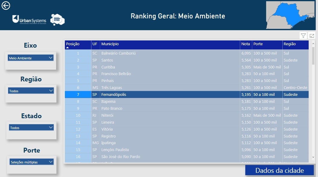 Feito pela Urban Systems em parceria com a Necta, há sete anos, o ranking considera diversos aspectos para mapear cidades com mais de 50 mil habitantes, om maior potencial de desenvolvimento no Brasil – as chamadas cidades inteligentes.