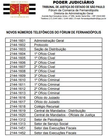 A Diretoria de Administração Geral do Fórum da Comarca de Fernandópolis distribuiu comunicado para informar os novos telefones disponíveis para atendimento ao público. Os novos números já estão em pleno funcionamento e, em breve, os antigos serão desativados, diz a nota. Confira abaixo a lista completa dos novos números disponibilizados.